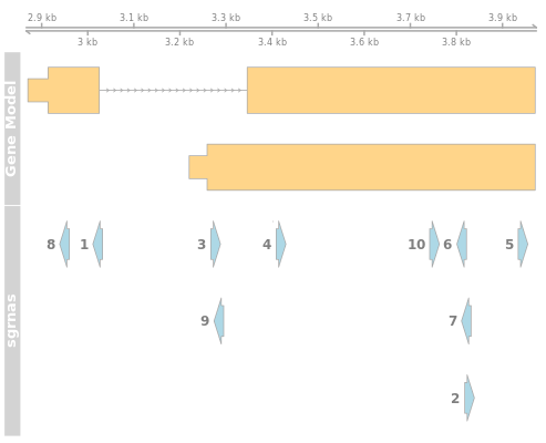 The gene plot displays the physical location of the gRNAs against the gene models. Each row in the gene model represents an isoform of the gene. The gray lines are introns and yellow bars exons. The thinner bars indicate UTRs.