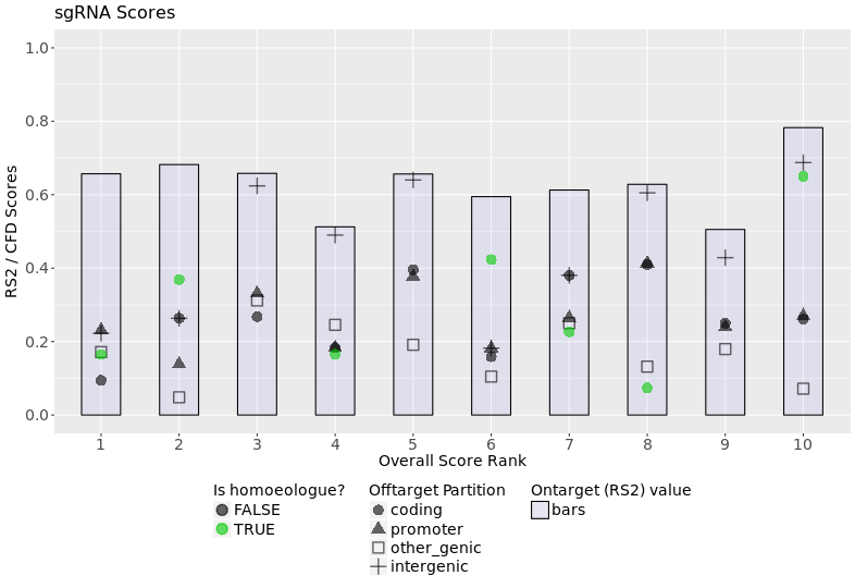 This plot displays a visualization of the scores found in the table, plus the score for any offtargets hits to homoeologues. The blue-gray bars shows the RS2 (ontarget) score, the black points indicate the worst CFD scores for each region (coding, promoter, other genic, intergenic), and the green points, if any, show the CFD scores for homoeologues.